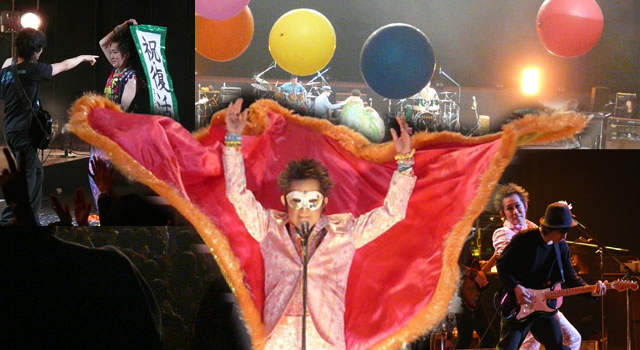 | 開演前から歓声が飛び交う武道館!清志郎はステージ裏まで超満員の中いつものマント姿で登場!武道館でもマントショー布団ショーは健在です! |
